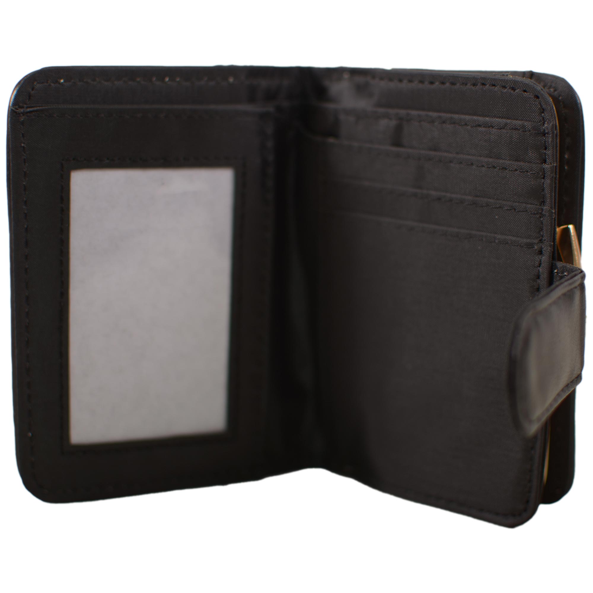 Features a clip frame section with a popper fastening pocket inside and a rear ID window.