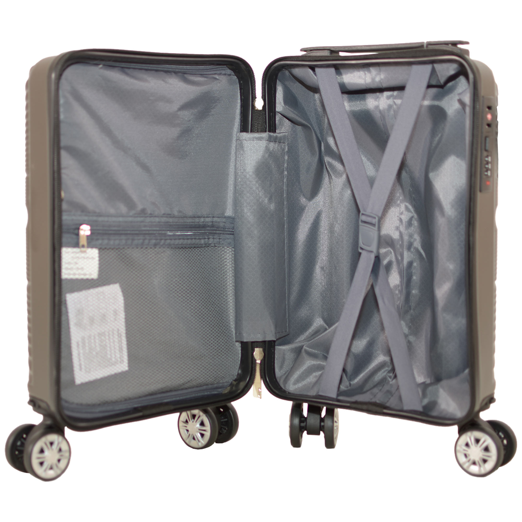 -One big compartment with buckle locks for holding the clothes. – Includes 2 cabin cases. A 20″ and a 15″ Case