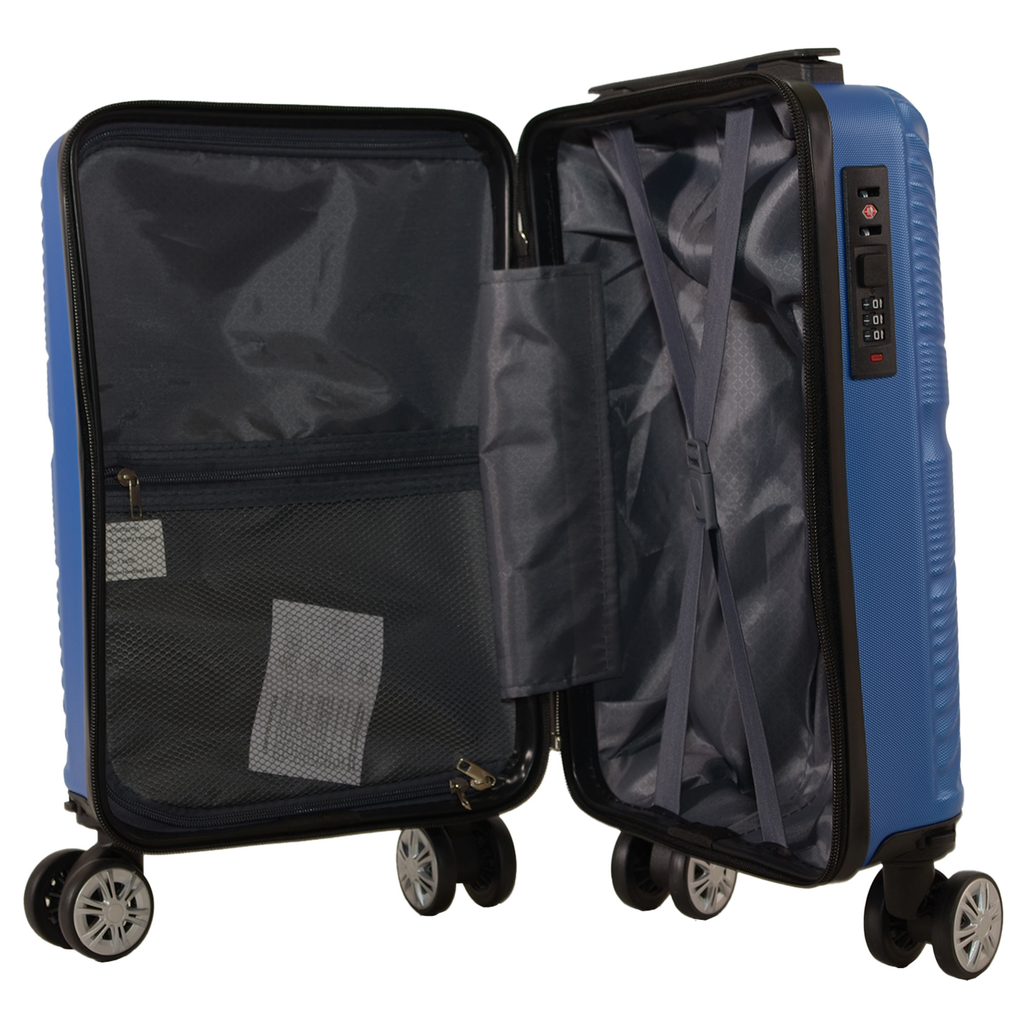 -One big compartment with buckle locks for holding the clothes.                                                                                                                                                                                    – Includes 2 cabin cases. A 20″ and a 15″ Case