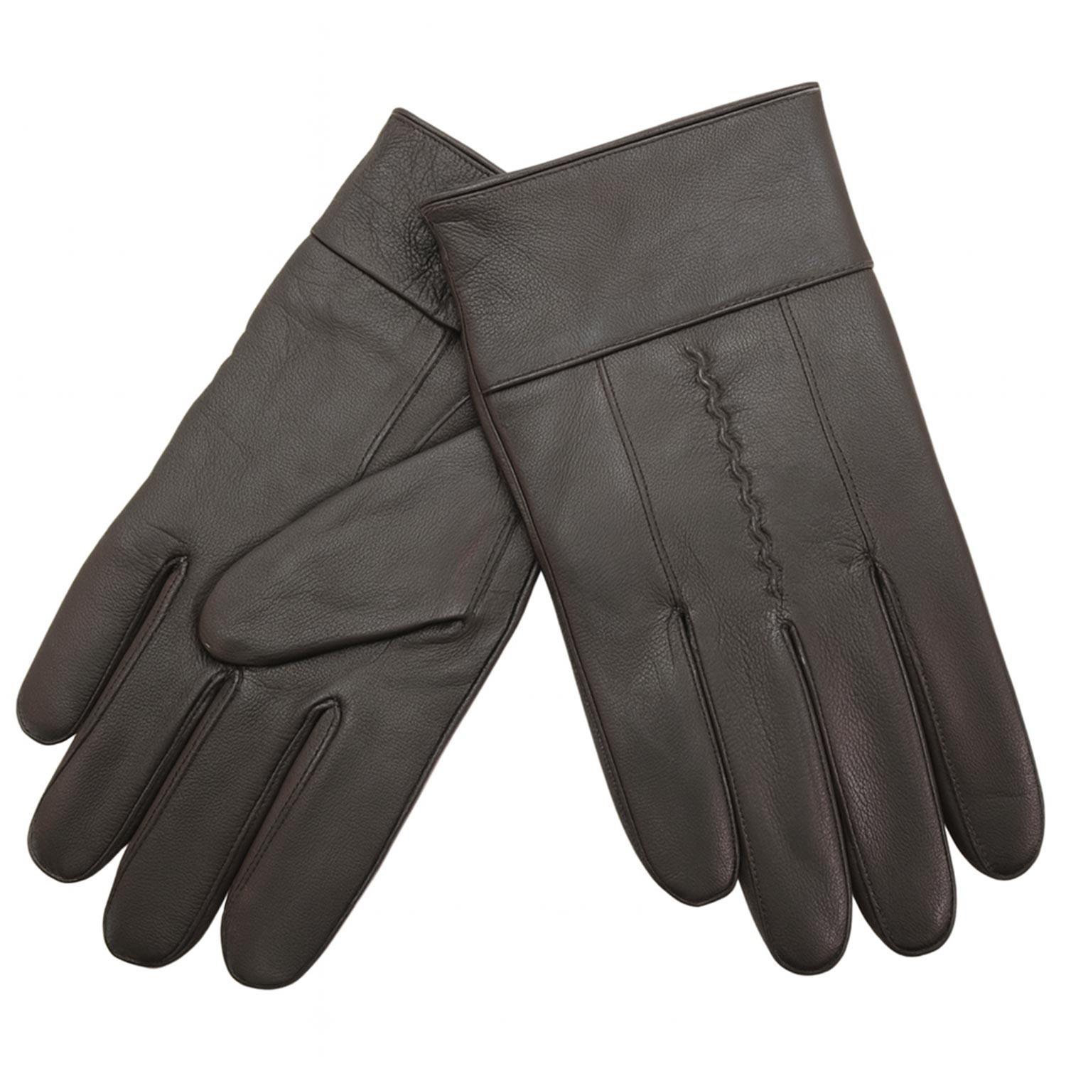 Black finished leather with a decorative pressed design on the back of each glove.